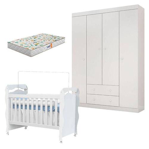 Berço Americano New Nanda com Guarda Roupa Helena Branco Brilho e Colchão Gazin Phoenix