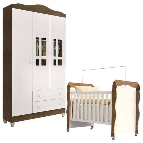 Berço Americano New Nanda e Guarda Roupa Infantil Ariel 3 Portas Branco Acetinado Amadeirado Carolina