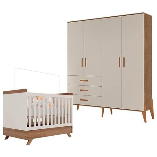 Berço Americano Retro Vitória com Guarda Roupa Infantil Emilly 4 Portas Off White Carvalho - Canaã