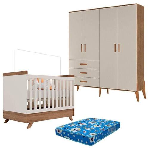 Berço Americano Retro Vitória e Guarda Roupa Infantil Emilly 4 Portas Off White Carvalho com Colchão Ortobom - Canaã