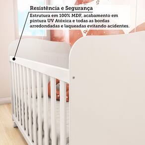 ESPECIFICAÇÕES: Estrutura em MDF Pintura UV atóxica Certificado pelo INMETRO 001950/2019 Padrão americano 3 Regulagens de altura do estrado Bordas arredondadas e laqueadas Grades fixas 4 Rodízios sendo 2 com trava e 2 sem trava Suporta até 40kg Acompanha suporte mosquiteiro Colchão recomendado 130 x 70 cm Não acompanha colchão Não possui a opção de montagem como mini cama