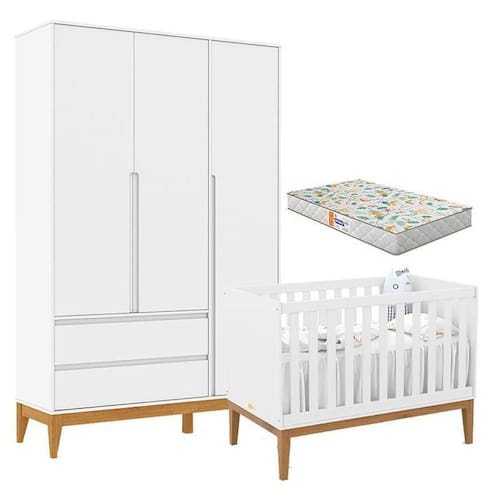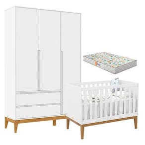 Berço Americano Unique e Guarda Roupa 3 Portas Nature Clean Branco Soft Eco Wood com Colchão Gazin Matic