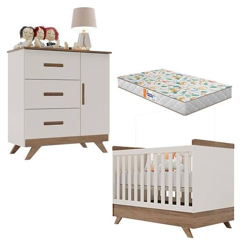 Berço Americano Vitória e Cômoda Retro Maya Off White Carvalho com Colchão Gazin – Canaã