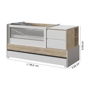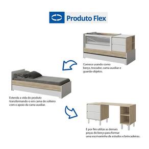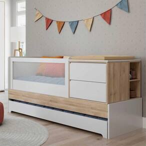 O Berço Cama Sol e Mar Divicar é um produto muito completo e moderno. Ele possui 2 regulagens de altura para o estrado (Colchão 70x130cm) e além disso possui um sistema pneumático exclusivo que inclina parte do estrado em 21 , evitando o refluxo do bebê. A grade lateral é revestida com um tecido 100% poliester (altamente resistente) que dá maior aconchego e permite que os papais visualizem o bebê dentro do bercinho. Este produto conta com uma cômoda acoplada na lateral que tem profundidade planejada para ser utilizada como trocador. A mesma possui 2 gavetões (com sistema anti esmagamento) e 2 nichos onde pode ser armazenado objetos e fraldas. Outro detalhe a se considerar é que este produto conta com uma cama auxiliar que fica embutida embaixo do berço e pode ser utilizada pela babá por exemplo. O berço de Sol e Mar é um produto que tem sua vida útil por muito mais tempo, pois após utilizar como berço é possível montar como uma cama de solteiro e continua com a cama auxiliar embaixo. Nesta fase sobrarão algumas peças e com as mesmas é possível montar uma escrivaninha ou então uma estante, conforme as fotos. Berço Certificado pelo INMETRO sob o Selo n 000136/2013. NÃO acompanha colchão.