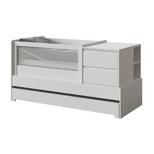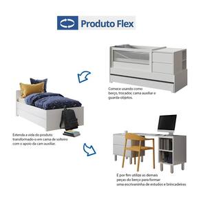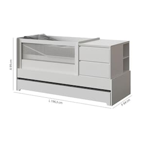 O Berço Cama Sol e Mar Divicar é um produto muito completo e moderno. Ele possui 2 regulagens de altura para o estrado (colchão 70x130cm) e além disso possui um sistema pneumático exclusivo que inclina parte do estrado em 21, evitando o refluxo do bebê. A grade lateral é revestida com um tecido 100% poliester (altamente resistente) que dá maior aconchego e permite que os papais visualizem o bebê dentro do bercinho. Este produto conta com uma cômoda acoplada na lateral que tem profundidade planejada para ser utilizada como trocador. A mesma possui 2 gavetões (com sistema anti esmagamento) e 2 nichos onde pode ser armazenado objetos e fraldas. Outro detalhe a se considerar é que este produto conta com uma cama auxiliar que fica embutida embaixo do berço e pode ser utilizada pela babá, por exemplo. O berço de Sol e Mar é um produto que tem sua vida útil por muito mais tempo, pois após utilizar como berço é possível montar como uma cama de solteiro e continua com a cama auxiliar embaixo. Nesta fase sobrarão algumas peças e com as mesmas é possível montar uma escrivaninha ou então uma estante. Berço Certificado pelo INMETRO sob o Selo n 000136/2013. NÃO acompanha colchão.