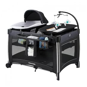 Centro de cuidados infantis durável Este centro de cuidados infantis é composto por uma estrutura resistente e tecidos grossos, que podem acomodar bebês de até 15 kg. Existem duas rodas com freios na parte inferior do berço, que podem se mover com flexibilidade.