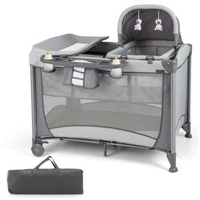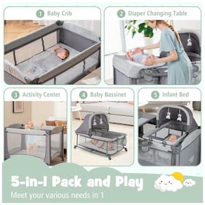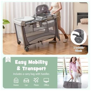 Design 4 em 1: Combina cercadinho, berço de cabeceira, trocador de fraldas e cama de viagem no produto, este playard para bebês é adequado para bebês recém nascidos de 0 a 36 meses e acompanha o crescimento do bebê. Depois de retirar o berço de viagem, o amplo espaço permite ao bebé praticar ficar em pé e caminhar contra as paredes de malha circundantes. Conveniente para babá: Este playard vem com rodas traváveis para facilitar a movimentação e ficar imóvel para ser servido como berço de cabeceira. E está equipado com paredes de malha para ventilação adequada e fácil babá. Caixa de música e brinquedos giratórios: Equipado com caixa de música e brinquedos, este brinquedo para bebês pode fazer com que seu bebê adormeça facilmente. Os dois brinquedos pendurados atraem a atenção do bebê, não só promovendo o desenvolvimento visual do bebê, mas também melhorando a capacidade de preensão. Cesta grande guarda fraldas: vem com cesta de zenamento para trocar fraldas e itens essenciais de viagem, este playard de bebê é perfeito para viagens. E está equipado com bolsa de transporte e pode ser como berço de viagem para uso ao ar livre. Construção estável e durável: Feito de aço e material PP, este playard para bebês é estável para um bebê aprender a andar nele. E vem com colchão grosso e confortável, respirável para os bebês dormirem