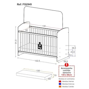 Berço: Altura: 91,5cm | Largura: 132,5cm | Profundidade: 68,5cm