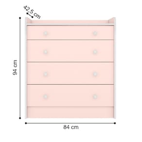 A cômoda é feita em MDP 15/12mm, possuindo quatro gavetas com corrediças metálicas.