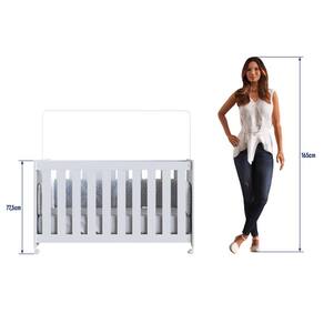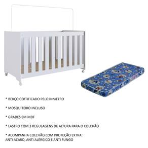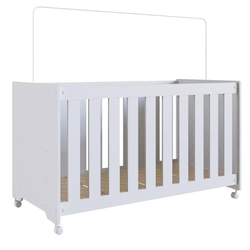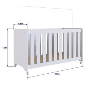 O berço possui um acabamento fosco e é feito de MDP, um material durável e resistente. Suas dimensões montadas são 133x77,5x64,8 cm, e o peso do produto é de 24,48 kg. Ele suporta um peso de até 30 kg e vem em 3 volumes para facilitar o transporte e a montagem. A grade do berço é fixa e feita de MDF BP, com um espaçamento entre as barras de 5,5 cm. O estrado é composto por suportes de lastros em madeira maciça e lastros em MDF, oferecendo três opções de altura: 15 cm, 29 cm e 44 cm. O berço também acompanha suporte de mosquiteiro, sem véu. O colchão indicado para este berço tem as dimensões de 130x60 cm e está incluso na compra. O berço não possui gaveta, corrediça ou pés, mas conta com rodízios, sendo 2 com trava e 2 sem trava, para facilitar a movimentação do berço quando necessário. A montagem do berço é necessária e possui um nível médio de dificuldade. O sistema de montagem inclui parafusos, cavilhas e pregos.