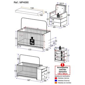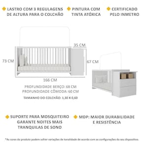 O Berço Cômoda com Colchão Incluso e Poltrona de Amamentação Meu Bebê Multimóveis MP4090 foi criado para complementar o quartinho, facilitando a vida da mamãe nos preparativos para a chegada do bebê. O berço é padrão nacional (tamanho do colchão 130cm x 60cm), produzido em MDP com acabamento acetinado (cerca de 20% de brilho), que garante maior durabilidade e facilidade na limpeza. A cômoda acoplada (não é possível montar separadamente) possui 2 gavetas espaçosas com corrediças metálicas, que proporcionam mais leveza no manuseio e um nicho para deixar o quartinho organizado. O lastro possui 3 regulagens de altura para o colchão e acompanha suporte para mosquiteiro, que garante noites mais tranquilas de sono. Berço Certificado pelo INMETRO sob o Selo n 012251/2022. O Colchão D18 (suporta 50kg), que acompanha o berço, é produzido 100% em tecido poliéster com preenchimento em espuma. Possui tratamento anti-ácaro e anti-alérgico e é indicado para crianças de até 3 anos. A poltrona de amamentação é produzida em madeira de eucalipto, com revestimento em tecido veludo, molas reforçadas e mecanismo de balanço, proporcionando muito aconchego. Capaz de suportar 110kg, o assento possui densidade D23, que garante maior conforto e durabilidade.