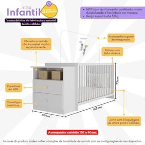 Segurança e conforto: A grade é ecologicamente correta, feita com matéria-prima livre de metais pesados, atóxica e com proteção anti-amarelamento. O lastro conta com 3 regulagens de altura, permitindo ajustes conforme o crescimento da criança, e o suporte para mosquiteiro oferece proteção extra contra insetos.