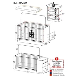 Especificações técnicas: Berço - Altura: 73cm | Largura: 133cm | Profundidade: 66cm Colchão - Altura: 10cm | Largura: 130cm | Profundidade: 60cm Material: MDP com grades soft (PVC) Regulagem de altura: 3 níveis Suporte para mosquiteiro: Sim Colchão incluso: Sim, tamanho 130x60cm Certificado pelo Inmetro: Sim (Selo n 012251/2022)
