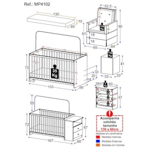 O Berço Cômoda com Colchão, Poltrona de Amamentação e Puff Meu Bebê Multimóveis MP4102 foi criado para complementar o quartinho, facilitando a vida da mamãe nos preparativos para a chegada do bebê. O berço é padrão nacional (tamanho do colchão 130cm x 60cm), produzido em MDP com acabamento acetinado (cerca de 20% de brilho), que garante maior durabilidade e facilidade na limpeza. A cômoda acoplada (não é possível montar separadamente) possui 2 gavetas espaçosas com corrediças metálicas, que proporcionam mais leveza no manuseio e um nicho para deixar o quartinho organizado. O lastro possui 3 regulagens de altura para o colhão e acompanha suporte para mosquiteiro, que garante noites mais tranquilas de sono. Berço Certificado pelo INMETRO sob o Selo n 012251/2022. O Colchão D18 (suporta 50kg), que acompanha o berço, é produzido 100% em tecido poliéster com preenchimento em espuma. Possui tratamento anti-ácaro e anti-alérgico e é indicado para crianças de até 3 anos. A poltrona de amamentação é produzida em madeira de eucalipto, com revestimento em tecido veludo, molas reforçadas e mecanismo de balanço, proporcionando muito aconchego. Capaz de suportar 110kg, o assento possui densidade D23, que garante maior conforto e durabilidade. Já o puff possibilita o descanso das pernas e dos pés tornando esse momento ainda mais confortável.