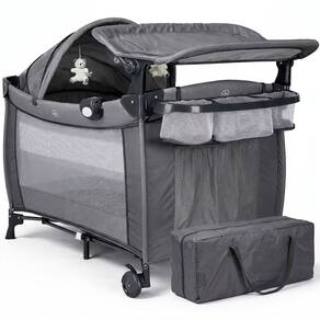 Berço de Bebê Portátil Zooper Cinza com Trocador Mosquiteiro Bolsa e Caixa Musical Som e Luz Dobrável Desmontável