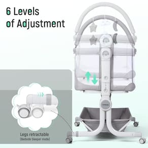 - Multimodos: cabeceira co-sleeper pode ser utilizado como um berço independente e cama de cabeceira. O co-sono pode ser alcançado simplesmente abaixando a barra lateral, e duas tiras de fixação  podem ser presas à cama da mãe para uma conexão perfeita com a cama da mãe e podem ser montadas sem ferramentas. Com 4 rodas universais de freio, você pode mover facilmente o berço do quarto para a sala de estar ou para qualquer lugar da sua casa. Observação: coloque as rodas no modo de freio quando não estiver se movendo.