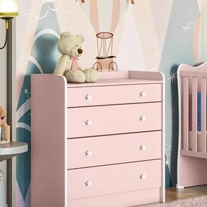 A cômoda é feita em MDP 15/12mm, contém quatro gavetas com corrediças metálicas.