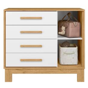 A cômoda é feita em MDP 15mm, possuindo quatro gavetas com corrediças metálicas e uma porta com amplo espaço para organizar sapatos e roupas.