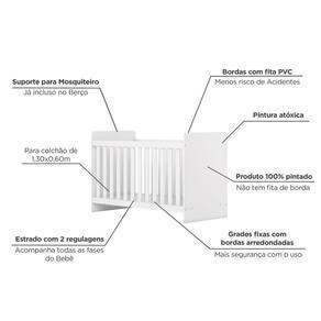 - Suporte para mosquiteiro. Acabamento: Pintura UV Acompanha Cama Auxiliar: Não Acompanha Móbile: Não Acompanha Suporte para Mosquiteiro: Não Altura: 87 cm Altura do Estrado até o Chão: 21,6 cm Ambiente Principal: Quarto de Bebê Berço 3 em 1: Não Certificado: 001 087/2020 codigo_ean: 7900288272089 Complexidade da Montagem: Média: pode ser montado por mais de uma pessoa e/ou necessite de maior conhecimento para montagem Cor: Branco Cor do Produto: Branco Escala de Brilho: Fosco Estilo: Moderno Estrado com Regulagem de Altura: Sim Estrado Regulável em Quantas Posições: 02 Itens Inclusos: 1 Berço, Kit Ferragens e Manual de Montagem Largura: 132,5 cm Linha ou Coleção: Sonho Encantado Manual de Montagem e Instalação: https://product-hub-prd.madeiramadeira.com.br/738433600/documents/01851b72-004e-4637-98ab-bb3055087cff3246767326617591633640478.pdf Marca: Espresso Móveis Material da Grade: MDF Material do Estrado: MDF/MDP Material Principal: MDF/MDP Multifunção Flex: Não Necessita Montagem: Sim Opções de Altura do Estrado: 2 Origem do Produto: Nacional Permite a Utilização de Cama Auxiliar: Não Peso: 19 kg Pintura Atóxica: Sim Portátil: Não Possui Gavetas: Não Possui Pés: Não Possui Portas: Não Possui Prateleiras: Não Profundidade: 66 cm Recomendações de Uso, Manutenção e Limpeza: Para limpeza de seu móvel, use uma flanela limpa e seca. Não utilize produtos químicos que possam danificar o produto. Sistema Anti-Refluxo: Não Sistema de Montagem: Parafusos e Cavilhas Suporta Até (kg): 25 kg Tamanho do Colchão Indicado (L x C): 130 x 60cm Tipo de Berço: Berço Padrão Nacional Tipo de Estrado: Removível Tipo de Grade: Fixa