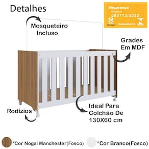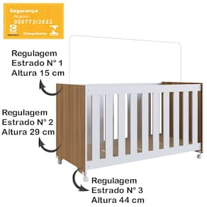 Berço Infantil certificado pelo INMETRO n° 000772/2022, além de ser um produto versátil e multifuncional, conta com um design lindo e sofisticado, deixando o ambiente ainda mais moderno e aconchegante. Estrutura em MDP de 15 mm, feito com material ecologicamente correto, para melhor durabilidade e resistência à peça, e excelente acabamento em Finish Foil (Fosco). Composto por estrado em MDF de 6 mm com altura regulável em três opções: 1ª: 15 cm 2ª: 29 cm e 3ª: 44 cm, travessas em MDF de 15 mm, grades fixas em MDF de 12 mm, com espaço entre elas de 5,5 cm e acabamento em BP, acompanha suporte para mosquiteiro e rodízios plásticos. O colchão indicado é de 130x60 cm (Não Acompanha Colchão). Suporta até 30 kg distribuídos. Este móvel chegará em sua casa separado em 02 volumes.