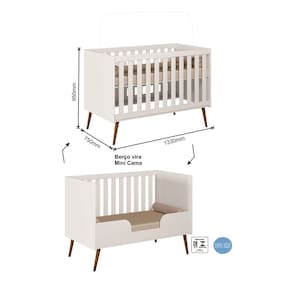 O Berco Mini Cama é perfeito para quem deseja um Quarto Infantil onde a praticidade, segurança, aconchego sejam pontos essenciais para a composição do quarto do seu Bebê, sem esquecer é claro de uma linda decoração. Todos os berços da Peternella são certificados pelo INMETRO. Um requisito fundamental para sua segurança e a do bebê. Berco Mini Cama Retro NoahO Berço/Mini Cama Retrô Noah Peternella é produzido em MDF bio-sustentável. É aprovado e certificado conforme regulamento do Inmetro, conta ainda com pintura UV, suporte para mosquiteiro, quatro pés de madeira, estilo retrô. Suas grades fixas de MDF proporcionam uma maior segurança ao bebê. Seu padrão é de berço americano e posteriormente poderá ser transformado em uma mini cama.CARACTERÍSTICASPintura Atóxica UV;Certificado pelo Inmetro;;Grades fixas;02 regulagens de altura do estrado.DimensõesAltura: 95 cmLargura: 133 cmProfundidade: 75 cm