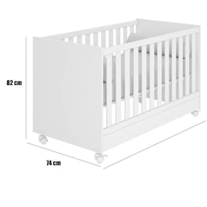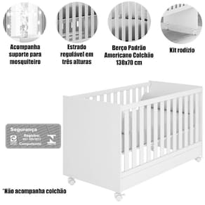 - Informações Adicionais: Medida para colchão: 70cm x 130cm, Estrado regulável em três alturas, suporte para mosquiteiro, Grades fixas feitas em MDF de 12mm e 25mm, Após transformação em Mini Cama, disponibiliza uma lateral de proteção para maior , Possui certificação compulsória de acordo com as portarias do Inmetro