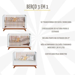 O Berço Infantil Sambalele Divicar valoriza a brasilidade através da mistura da madeira com sua cor natural, e também pelo seu design curvado. Além disso esse é um produto funcional 3 em 1, pois trata-se de um berço que acompanha o crescimento do bebê e pode ser montado como berço, sofá e posteriormente como minicama. Na fase berço esse produto conta com 3 posições de altura para o estrado (Colchão 70x130cm). Também possui um dispositivo que inclina parte no estrado em 21° , evitando assim o refluxo do bebê. Berço Certificado pelo INMETRO sob o Selo n° 005837/2019. NÃO acompanha colchão.