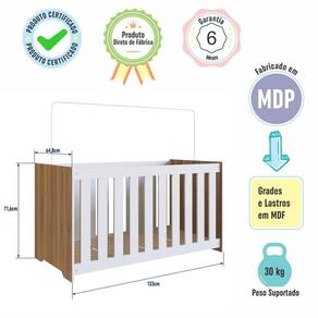 Marca: Completa Móveis | Modelo: Berço Simples | Material: MDP | Acabamento: Fosco | Cor: Nogal Manchester com Branco | Largura (cm): 133 | Altura (cm): 71,6 | Profundidade (cm): | Peso do Produto (Kg): 25,70 | Quantidade de Volume: 1 | Peso Suportado (Kg): 30 | do Certificado Registro do Inmetro: 000772/2022 | Tipo de Grade: Fixa | Material da Grade: MDF | Espaço entre Barras da Grade (cm.): 5,5 | Material do Estrado: Suportes dos lastros em madeira maciça e lastros em MDF | Quantidade de Regulagem do Estrado: 3 | Opções de Altura do Estrado (cm): 1 altura: 38; 2 altura: 23; 3 altura: 9 | Acompanha Suporte de Mosquiteiro: Sim, sem véu | Colchão Indicado (LxPxA) (cm): 130x60x10 | Acompanha Colchão: Não | Possui Gaveta: Não | Possui Rodízios: Não | Material dos Pés: MDP | Necessita Montagem: Sim | Nível de Dificuldade da Montagem: Médio | Sistema de Montagem: Sistema de montagem via parafusos, cavilhas e sistema minifix | Idade Recomendada (meses): 0 à 24 | Idade Mínima Recomendada (anos): 0 | Idade Máxima Recomendada (anos): 3 | Quantidade de Item: 1 | Duração da Garantia: 6 Meses | País de Origem: | Tipo de Garantia: Garantia do Fabricante | Dimensão (AxLxC) cm: 71,6x64,8x133 | Inclui Manual de Montagem: Sim
