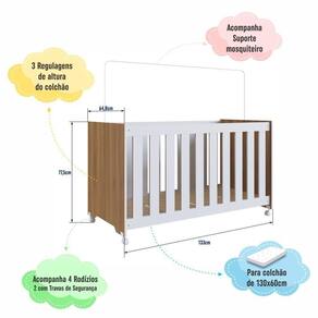 Marca: Completa Móveis | Modelo: Berço Simples | Material: MDP | Acabamento: Fosco | Cor: Nogal Manchester com Branco | Largura (cm): 133 | Altura (cm): | Profundidade (cm): | Peso do Produto (Kg): 26 | Quantidade de Volume: 2 | Peso Suportado (Kg): 30 | do Certificado Registro do Inmetro: 000772/2022 | Tipo de Grade: Fixa | Material da Grade: MDF | Espaço entre Barras da Grade (cm.): 5,5 | Material do Estrado: Suportes dos lastros em madeira maciça e lastros em MDF | Quantidade de Regulagem do Estrado: 3 | Opções de Altura do Estrado (cm): 1 altura: 44; 2 altura: 29; 3 altura: 15 | Acompanha Suporte de Mosquiteiro: Sim, sem véu | Colchão Indicado (LxPxA) (cm): 130x60x10 | Acompanha Colchão: Não | Possui Gaveta: Não | Possui Rodízios: Sim, 2 com trava e 2 sem trava | Material dos Pés: MDP | Necessita Montagem: Sim | Nível de Dificuldade da Montagem: Médio | Sistema de Montagem: Sistema de montagem via parafusos, cavilhas e sistema minifix | Idade Recomendada (meses): 0 à 24 | Idade Mínima Recomendada (anos): 0 | Idade Máxima Recomendada (anos): 3 | Quantidade de Item: 1 | Duração da Garantia: 6 Meses | País de Origem: | Tipo de Garantia: Garantia do Fabricante | Dimensão (AxLxC) cm: 77,5x64,8x133 | Inclui Manual de Montagem: Sim