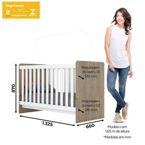 O Berço Labirinto, certificado pelo Inmetro, é perfeito para acompanhar o crescimento da criança. Com uma estrutura resistente de MDF, o móvel possui A: 87 x L: 132 x P: 66 Cm, ele é ideal para colchão de 1,30 x 0,70 m. O design do berço ganha destaque pela suavidade de tons, que agregam amplitude ao quarto, criando um efeito harmonioso e clean! Aproveite para dar uma olhada em outros módulos da linha Infantil Labirinto e monte o quartinho ideal para o seu bebê! Acabamento: Pintura Texturizada UV Acompanha Cama Auxiliar: Não Acompanha Colchão: Não Acompanha Dossel: Não Acompanha Móbile: Não Acompanha Suporte para Mosquiteiro: Sim - Sem Véu Altura: 87 Altura do Estrado até o Chão: 87 Altura dos Pés: cm Ambiente Principal: Quarto de Bebê Certificado: INMETRO N° Registro 001 087/2020 Complexidade da Montagem: Média: pode ser montado por mais de uma pessoa e/ou necessite de maior conhecimento para montagem Cor: Rústico/Branco Cor do Produto: Rústico/Branco Cor Predominante: Branco Escala de Brilho: Fosco Estilo: Moderno Estrado com Regulagem de Altura: Sim Estrado Regulável em Quantas Posições: 02 Itens Inclusos: 1 Berço, Kit Ferragens e Manual de Montagem Largura: 132.5 Linha ou Coleção: Labirinto Manual de Montagem e Instalação: https://cdn2.madeiramadeira.com.br/atributo/henn-infantil-e-bebe-cozinha/1369293-ia19-berco-labirinto.pdf Material da Grade: MDF Material do Estrado: MDF Material Principal: MDF Multifunção Flex: Não Necessita Montagem: Sim Opções de Altura do Estrado: 02 Posições Regulagem alta 510mm do chão ate a parte de cima do Lastro e Mais Baixa 216 mm Origem do Produto: Nacional Permite a Utilização de Cama Auxiliar: Não Peso: 19 Pintura Atóxica: Sim Portátil: Não Possui Gavetas: Não Possui Pés: Não Possui Portas: Não Possui Prateleiras: Não Profundidade: 66 Recomendações de Uso, Manutenção e Limpeza: Para limpeza de seu móvel, use uma flanela seca ou umedecida. Não utilize produtos químicos que possam danificar o produto. Sistema Anti-Refluxo: Não Sistema de Montagem: Parafusos e cavilhas. Suporta Até (kg): 25 Tamanho do Colchão Indicado (L x C): 70 x 130 cm Tipo de Berço: Berço Padrão Nacional Tipo de Estrado: Fixo Tipo de Grade: Fixa