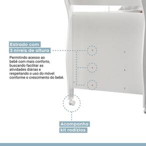 Berço Mini Cama 100% MDF Slim Branco. O seu bebê merece ter um lugar especial para ele aproveitar as noites iniciais de sono, não é mesmo? E por isso, é importante apostar em móveis certeiros como o Berço 100% MDF Slim! O visual clássico confere elegância e aconchego para o quarto do recém-nascido, dando mais liberdade na hora de decorar o espaço para recebê-lo. Ah, a peça ainda conta com 2 regulagens de altura para se adaptar melhor às necessidades do dia a dia. Gostou? Ean: 7898560326417