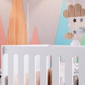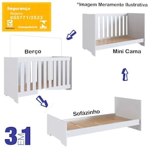 Berço Infantil certificado pelo INMETRO n 000771/2022, além de ser um produto versátil e multifuncional, conta com um design lindo e sofisticado, deixando o ambiente ainda mais moderno e aconchegante. Estrutura em MDP de 15 mm, feito com material ecologicamente correto, para melhor durabilidade e resistência à peça, e excelente acabamento em Finish Foil (Fosco). Composto por estrado em MDF de 6 mm com altura regulável em três opções: 1: 15 cm 2: 35 cm e 3: 45 cm, travessas em MDF de 15 mm, grades fixas em MDF de 12 mm com espaço entre elas de 5,5 cm e acabamento em BP, acompanha suporte para mosqueteiro. O colchão indicado é de 130x60 cm (Não Acompanha Colchão). Pode ser montado como berço, mini cama ou sofázinho. Suporta até 30 kg distribuídos. Este móvel chegará em sua casa separado em 01 volume.