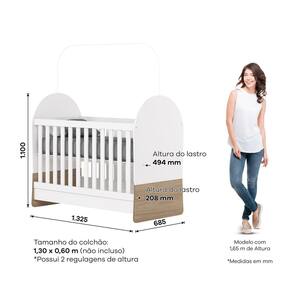 Caracteristicas: Acabamento atoxica Berco vira mini cama Bordas em fita PVC Estrado com duas regulagens de altura Estrutura em MDP 6,12,15,22 e 25mm Grades fixas com bordas arredondadas Nao acompanha colchao Peso maximo suportado 25kg Selo INMETRO 003448/2024 Suporte para mosqueteiro Tamanho colchao indicado, 1,30x0,60m