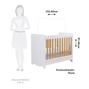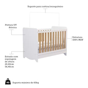 Características: Acabamento pintura UV atóxica Berço 3 em 1 Bordas arredondadas Cabeceira e peseira com rodapés torneados Certificado do Inmetro 004867/2020 Estrutura 12mm Estrutura em MDF Grades fixas com barras de 25mm Não acompanha colchão Portaria Inmetro 143/2021 Suporta até 40kg Tamanho do colchão Indicado 70cm x 130cm Tipo de estrado regulável em 2 posições -24,40 e 56,40 - cm-