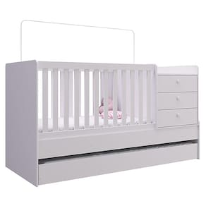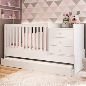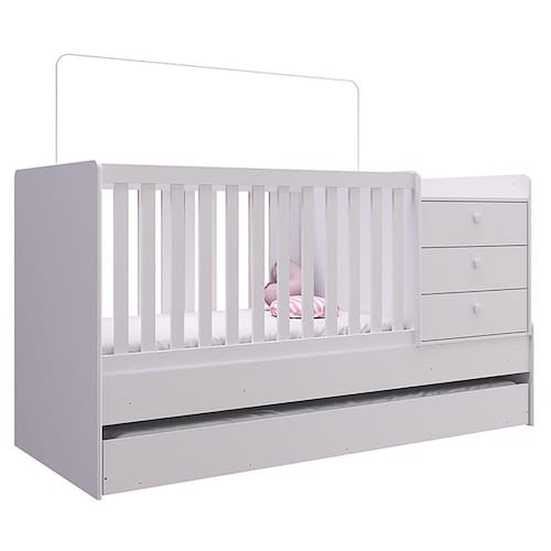 berço multifuncional é sua praticidade, já que ele possui suporte para mosquiteiro, estrado com 2 regulagens de altura, grade móvel, cômoda com 3 gavetas e trocador na lateral. Ou seja, tudo que o