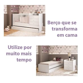 berço que vira caminha e a cômoda lateral pode ser colocada como mesa de cabeceira! Em outras palavras, é um móvel que acompanha as fases de crescimento da criança. E ainda companha cama auxiliar! Demais, né?
