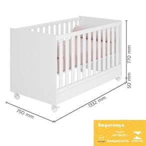 Berço Mini Cama Doce Sonho Branco Com Rodízios - Qmovi Branco Berço Mini Cama Doce Sonho com Rodízios - Qmovi O Berço Doce Sonho foi projetado especialmente para oferecer conforto e ao bebê. Com um design clássico e delicado, ele garante beleza e aconchego para o ambiente. Ele acompanha o desenvolvimento do seu filho se transformando em uma linda mini cama. O berço possui certificado do INMETRO, o que proporciona noites mais tranquilas e seguras. Uma escolha de amor e cuidado com o seu bebê. ESPECIFICAÇÕES: - Estrutura em MDP - Pintura UV atóxica - Padrão americano - Grades fixas - Estrado e travessas em MDF - Estrado regulado em 3 alturas: 1- 35cm, 2- 48cm, 3- 61cm - Acompanha suporte para mosquiteiro - Se transforma em mini cama - Certificado compulsório do INMETRO 007189/2017 - 4 Rodízios, sendo 2 com trava - Colchão recomendado 70x130cm - Não acompanha colchão