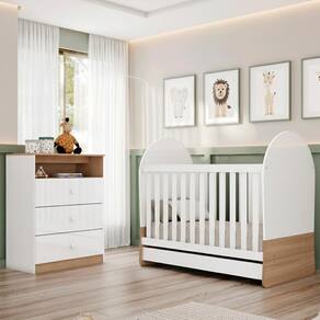 A cômoda conta com gavetas com corrediças telescópicas, nicho superior, puxadores em ABS e tampo chapéu com design soft. NÃO ACOMPANHA COLCHÃO E DEMAIS DECORAÇÕES. Produto entregue em 02 volumes.