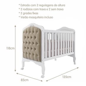 O Berço Mini Cama Harmonia é clássico e romântico, com cabeceiras detalhadas que adicionam elegância. Feito de MDF, é durável, resistente e ecologicamente correto. Certificado certificado pelo INMETRO, oferece segurança com duas regulagens de altura para o estrado e grades laterais fixas. Possui 4 rodízios sendo 2 com trava e 2 sem trava para fácil movimentação e bordas arredondadas com pintura atóxica. Inclui um varão mosquiteiro e uma barra de proteção lateral para transformá-lo em mini cama.