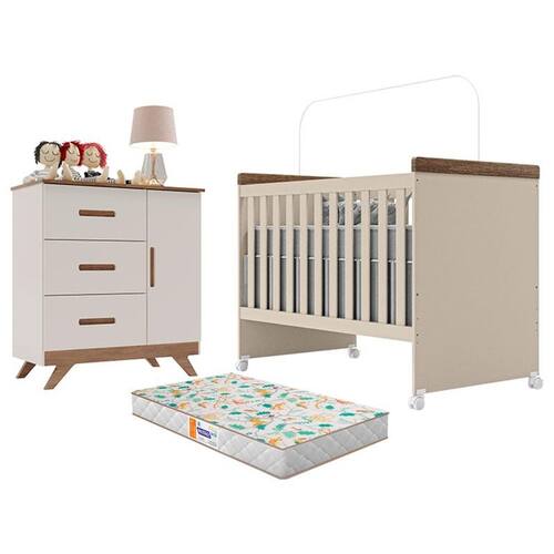 Berço Mini Cama Lívia e Cômoda Infantil Retro Maya Off White Carvalho com Colchão Gazin - Canaã