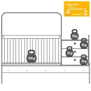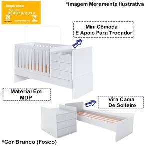 Berço Infantil certificado pelo INMETRO n 004976/2019, além de ser um produto versátil e multifuncional, conta com um design lindo e sofisticado, deixando o ambiente ainda mais moderno e aconchegante. Estrutura em MDP de 15 mm, e excelente acabamento em Finish Foil (Fosco). Composto por estrado em MDF de 6 mm com altura regulável em duas opções: 1: 43 cm 2: 71 cm, travessas em MDF de 15 mm, grades fixas em MDF de 12 mm, com espaço entre elas de 5,5 cm e acabamento em BP, acompanha suporte para mosqueteiro e sapatas. Quando montado em berço contém uma mini cômoda com 03 gavetas e corrediças metálicas (suporta 3 kg cada) e apoio para o trocador (suporta 5 kg). É possível, também, ser transformado em uma cama solteiro, sendo perfeita para quando seu bebê estiver crescidinho. O colchão indicado para o Berço é 130x70 cm e o colchão indicado para a Mini Cama é de 188x78 cm (Não Acompanha Colchão). Berço suporta 30 kg e a Mini Cama até 50 kg distribuídos. Este móvel chegará em sua casa separado em 03 volumes.