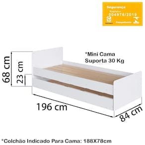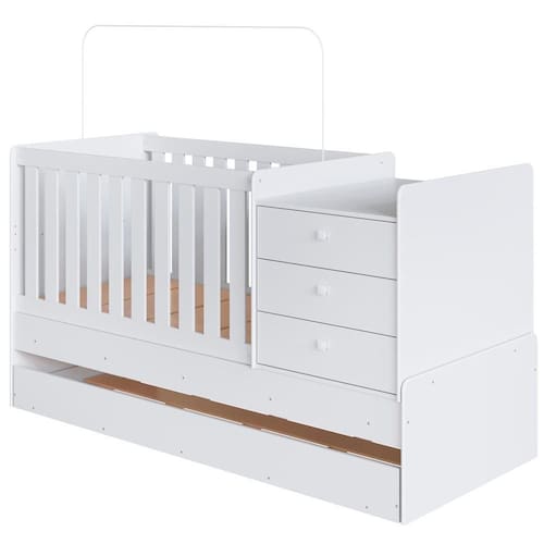 Berço Infantil certificado pelo INMETRO n 004976/2019, além de ser um produto versátil e multifuncional, conta com um design lindo e sofisticado, deixando o ambiente ainda mais moderno e aconchegante. Estrutura em MDP de 15 mm, e excelente acabamento em Finish Foil (Fosco). Composto por estrado em MDF de 6 mm com altura regulável em duas opções: 1: 43 cm 2: 71 cm, travessas em MDF de 15 mm, grades fixas em MDF de 12 mm, com espaço entre elas de 5,5 cm e acabamento em BP, acompanha suporte para mosqueteiro e sapatas. Quando montado em berço contém uma mini cômoda com 03 gavetas e corrediças metálicas (suporta 3 kg cada) e apoio para o trocador (suporta 5 kg). É possível, também, ser transformado em uma cama solteiro, sendo perfeita para quando seu bebê estiver crescidinho. Ainda para facilitar acompanha uma cama auxiliar com rodízios para melhor utilização. O colchão indicado para o Berço é 130x70 cm e o colchão indicado para a Cama é de 188x78 cm (Não Acompanha Colchão). Berço suporta 30 kg, Mini Cama suporta 50 kg e a Cama Auxiliar suporta até 80 kg distribuídos. Este móvel chegará em sua casa separado em 04 volumes.
