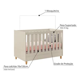 Características - Off White - Estrutura: MDF - Acabamento: Pintura UV - Berço vira mini cama - Grades de 25mm e 9mm - Estrado com 2 regulagens de altura - 1 Mosquiteiro aramado - Para colchão padrão americano de 70x130 cm(não incluso) - 4 Pés reforçados em madeira - Certificado pela Certa OCP 0033 - Registro 001132/2021 - Inmetro - Peso suportado: 25 kg - Móvel entregue desmontado, montagem não inclusa - Marca: Móveis Estrela