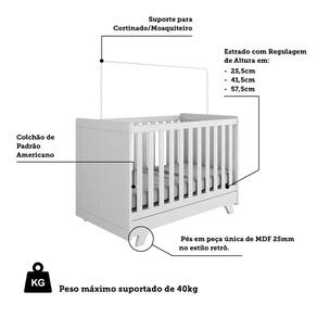 O Berço Mini Cama Retrô encanta pelas suas linhas retas, inspirado no estilo passado com um toque de modernidade para o quarto do seu bebê. É uma excelente opção pra quem busca conforto, segurança e beleza em um só produto. Quando conseguimos reunir tudo isso e ainda aumentar o tempo de uso do produto fica melhor ainda, temos a opção de transformar o berço em mini cama. O colchão a ser utilizado é o padrão Americano, com 70cm de largura por 130cm de comprimento, mais conforto com mais espaço. O varal para mosquiteiro está incluso e a base do colchão é regulável em 3 opções de altura, aumentando o conforto no uso diário e na segurança com o crescimento do seu pequeno(a). Com acabamento em pintura ultravioleta atóxica, e com a qualidade de ser produzido em 100% MDF. Acabamento: Verniz Acabamento dos Pés: Verniz Acompanha Cama Auxiliar: Não Acompanha Colchão: Não Acompanha Móbile: Não Acompanha Suporte para Mosquiteiro: Sim - Sem Véu Altura: 92,2 cm Altura do Estrado até o Chão: 29 cm Altura dos Pés: 7 cm Ambiente: Quarto de Bebê Certificado: 000781/2018 Complexidade da Montagem: Média: pode ser montado por mais de uma pessoa e/ou necessite de maior conhecimento para montagem Cor: Branco Brilho Cor: Branco Brilho Cor do Produto: Branco Brilho Cor Predominante: Branco Escala de Brilho: Brilhante Espaço Entre as Barras das Grades: 5,8 cm Estilo: Retrô Estrado com Regulagem de Altura: Sim Estrado Regulável em Quantas Posições: 03 Garantia do Fornecedor: 03 meses Itens Inclusos: 1 Berço e Manual de Montagem Largura: 135,5 cm Manual de Montagem e Instalação: https://cdn2.madeiramadeira.com.br/atributo/moveis-peroba/1080391-284940.pdf Material da Grade: MDF Material do Estrado: Madeira e MDF Material dos Pés: MDF Material Principal: MDF Montagem Flex: Mini Cama Multifunção Flex: Não Necessita Montagem: Sim Opções de Altura do Estrado: 29 cm - 45 cm - 61 cm Origem do Produto: Nacional Permite a Utilização de Cama Auxiliar: Não Peso: 39,28 kg Pintura Atóxica: Sim Possui Gavetas: Não Possui Pés: 04 Possui Portas: Não Possui Prateleiras: Não Possui Rodízio: Não Profundidade: 76,3 cm Recomendações de Uso, Manutenção e Limpeza: Para limpeza utilize somente pano limpo e macio, ligeiramente umidecido em água (apenas o bastante para remover a poeira), seguido de um pano seco. Sapatas Niveladoras: Não Sistema Anti-Refluxo: Não Sistema de Montagem: Parafusos Altoatarraxantes/Rosca Métrica, Porcas Metálicas, Buchas Plásticas, Minifix, Cavilhas de Madeira, Chapas Metálicas, Ponteiras Plásticas para Grades Suporta Até (kg): 40 kg Tamanho do Colchão Indicado (L x C): 70cm x 130cm Tipo de Estrado: Removível Tipo de Grade: Fixa