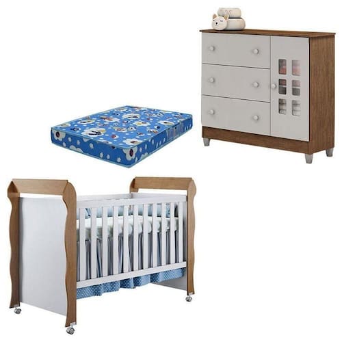 Berço Mirelle e Cômoda Mariah Branco Acetinado Amadeirado com Colchão Carolina