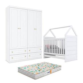 Berço Montessoriano Americano e Guarda Roupa Infantil Mississipi 4 Portas Branco com Colchão Gazin - Henn