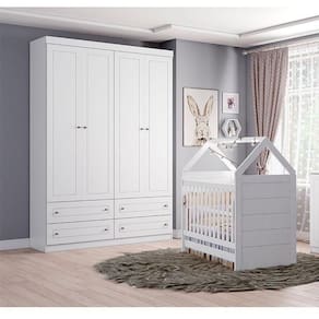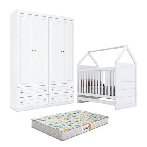 MDFBerço Montessoriano e Guarda Roupa Infantil Americano 4 Portas Branco com Colchão Gazin - Henn