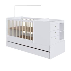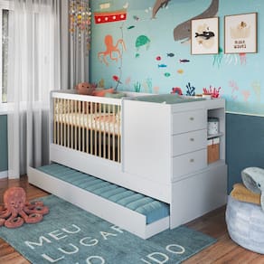 Berco Multifuncional 3 Gavetas com Cama Auxiliar Dengo Completa Moveis, e funcional e elegante, adaptando-se ao crescimento da crianca ao se transformar em cama de solteiro com comoda ou mesa de cabeceira. Conta com cama auxiliar, grades em Pinus e estrutura em MDP, unindo charme, funcionalidade e durabilidade.