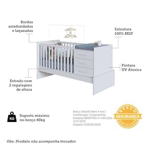 Berço Multifuncional Beni 4 em 1 com 3 Gavetas - Móveis Peroba Estrutura em MDF Pintura UV atóxica Certificado pelo INMETRO 010528/2024 Padrão americano 3 Gavetas Corrediças telescópicas Puxadores perfil externo em MDF revestido 4 em 1: Berço, trocador, gaveteiro e baú integrados além de também poder ser transformado em cama solteiro 2 Regulagens de altura do estrado Molduras com bordas arredondadas e laqueadas Grades fixas Suporta até 40kg Acompanha suporte mosquiteiro Não acompanha trocador Colchão recomendado para berço 130 x 70 cm