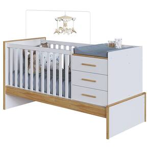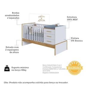 Berço Multifuncional Beni 4 em 1 com 3 Gavetas - Móveis Peroba O Berço Multifuncional Beni 4 em 1 é a solução ideal para quem busca praticidade e economia de espaço. Com estrutura em MDF e pintura UV atóxica, ele é certificado pelo INMETRO e combina berço, trocador, gaveteiro e baú em um único móvel, podendo ainda ser transformado em uma cama de solteiro. Possui 3 gavetas com corrediças telescópicas, puxadores perfil em MDF revestido, 2 regulagens de altura do estrado, grades fixas e molduras com bordas arredondadas e laqueadas. Suporta até 40kg e acompanha suporte para mosquiteiro.
